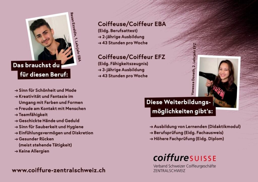 | Coiffeur/Coiffeuse EFZ (Eidgenössisches Fähigkeitszeugnis) | 3 Jahre | Grundlagen des Coiffeurhandwerks, praktische Fertigkeiten, Kundenberatung, Hygiene | Angestellter Coiffeur/Coiffeuse, Junior Stylist |