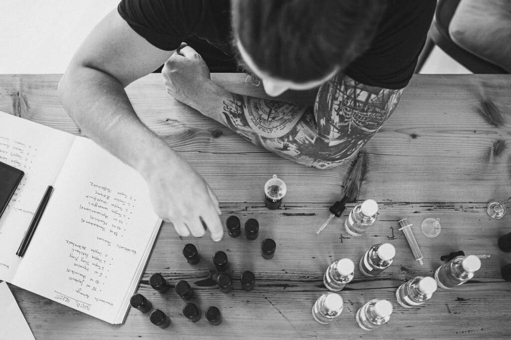 Nachdem du deine Trägerölbasis erstellt hast, kommt der spannende Teil: die Kreation deines ganz persönlichen Duftes mit ätherischen Ölen. Diese hochkonzentrierten Pflanzenextrakte verleihen deinem Bartöl nicht nur einen wunderbaren Geruch, sondern können auch zusätzliche pflegende oder beruhigende Eigenschaften haben. Wichtig ist hierbei die richtige Dosierung: Auf eine Menge von 30 ml Trägerölbasis genügen in der Regel 5 bis 10 Tropfen ätherisches Öl. Die goldene Regel lautet: Weniger ist mehr! Eine Überdosierung kann die Haut reizen.