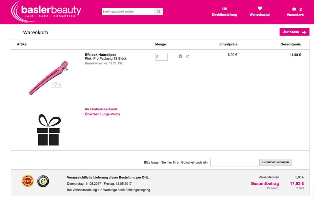 - Gutscheincode eingeben: Im Warenkorb finden Sie ein dafür vorgesehenes Feld, in das Sie Ihren Basler Beauty Gutscheincode eintragen können.