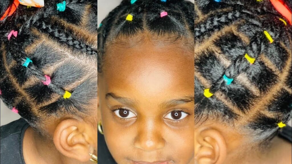 Wenn Sie nach einer Frisur suchen, die sowohl süß als auch raffiniert ist und sich perfekt für besondere Anlässe wie Geburtstagsfeiern, Familienfeiern oder Schulaufführungen eignet, sind halb-hoch halb-tief geflochtene Frisuren eine ausgezeichnete Wahl. Dieser Stil kombiniert die Eleganz eines Hochsteck-Looks mit der Lässigkeit offener Haare. Sie können den oberen Teil des Haares in aufwendige Zöpfe wie Cornrows oder Twists flechten, die dann zu einem Pferdeschwanz oder Dutt zusammengefasst werden, während der Rest des Haares offen und fließend bleibt. Für Kinder mit kürzerem Haar kann man hier geschickt Haarverlängerungen oder lockiges Häkelhaar einarbeiten, um mehr Länge und Volumen zu erzielen, ohne dass es unnatürlich aussieht. Das Ergebnis ist ein atemberaubender Look, der die Gesichtszüge betont und gleichzeitig die natürliche Schönheit der Haare feiert.