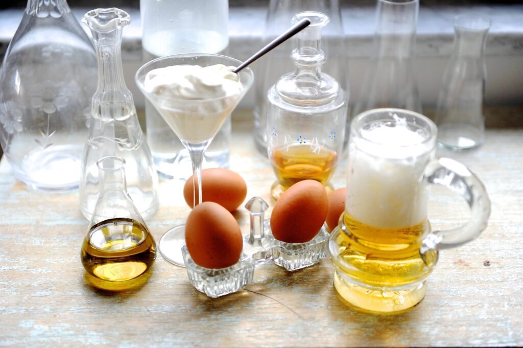 2. Variante 2 (Angereichert): Für eine noch intensivere Wirkung können Sie eine Paste aus Bier, einem Eigelb und einem Schuss Olivenöl anmischen. Eigelb liefert zusätzliche Proteine und Vitamine, während Olivenöl Feuchtigkeit spendet und das Haar geschmeidig macht. Verteilen Sie diese Mischung gleichmäßig auf dem Haar, von der Wurzel bis zu den Spitzen.