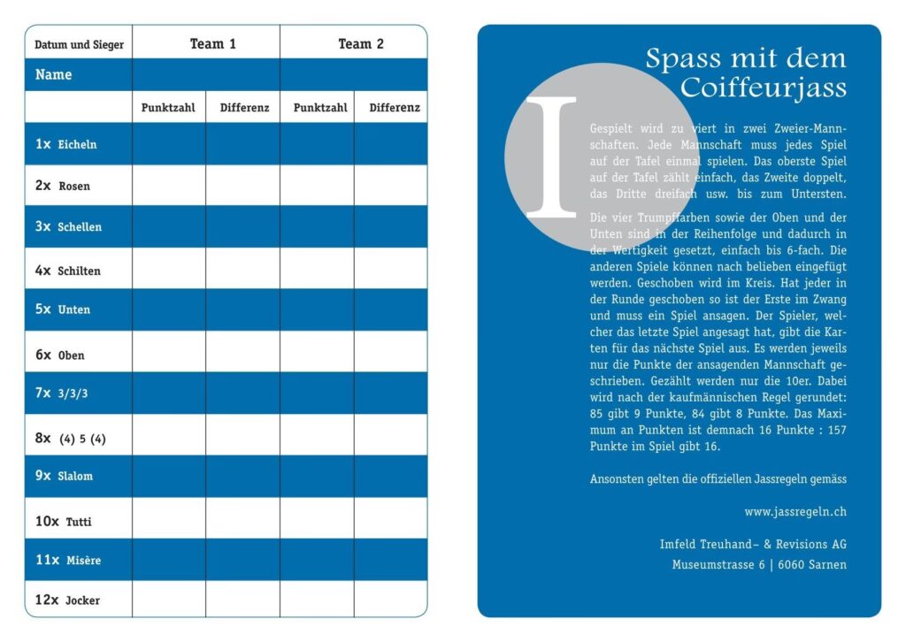 Der Coiffeur-Jass ist eine kreative Mischung aus Jass, Yatzy und Poker, die für mindestens zwei Zweierteams konzipiert ist. Das Hauptziel ist es, alle auf einer Liste vorgegebenen Spielarten einmal pro Team zu spielen. Die erreichten Punkte werden dabei der Gruppe gutgeschrieben, die die jeweilige Spielart bestimmt hat. Dies erfordert nicht nur Jass-Können, sondern auch taktisches Geschick bei der Auswahl der Spielarten und eine gute Kommunikation innerhalb des Teams. Es ist ein abwechslungsreiches Spiel, das verschiedene Kartenspiel-Elemente vereint.