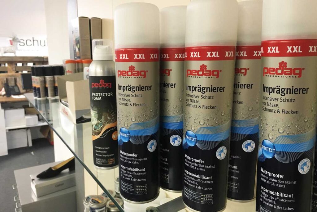 Imprägnierungen gibt es als Spray, Schaum oder – speziell für Textilien – als Wash-In-Mittel für die Waschmaschine. Sollten Sie sich oft in der Natur aufhalten oder anderswo widrigen Wetterbedingungen wie Regen, extremer Feuchtigkeit, Matsch oder Eis ausgesetzt sein, dann empfiehlt es sich, Ihre Schuhe zu imprägnieren.
